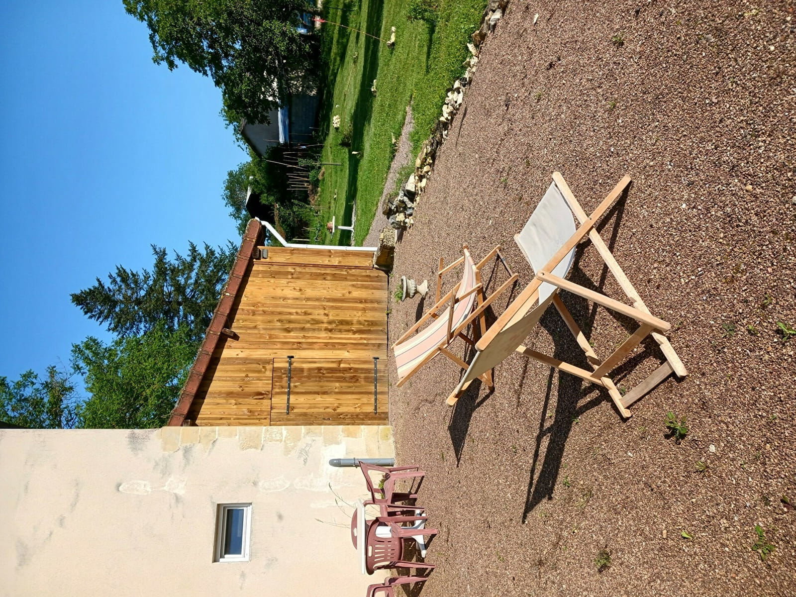 Grande terrasse avec vue sur le canal. Cuisine et salle de douche/WC réservés aux campeurs.