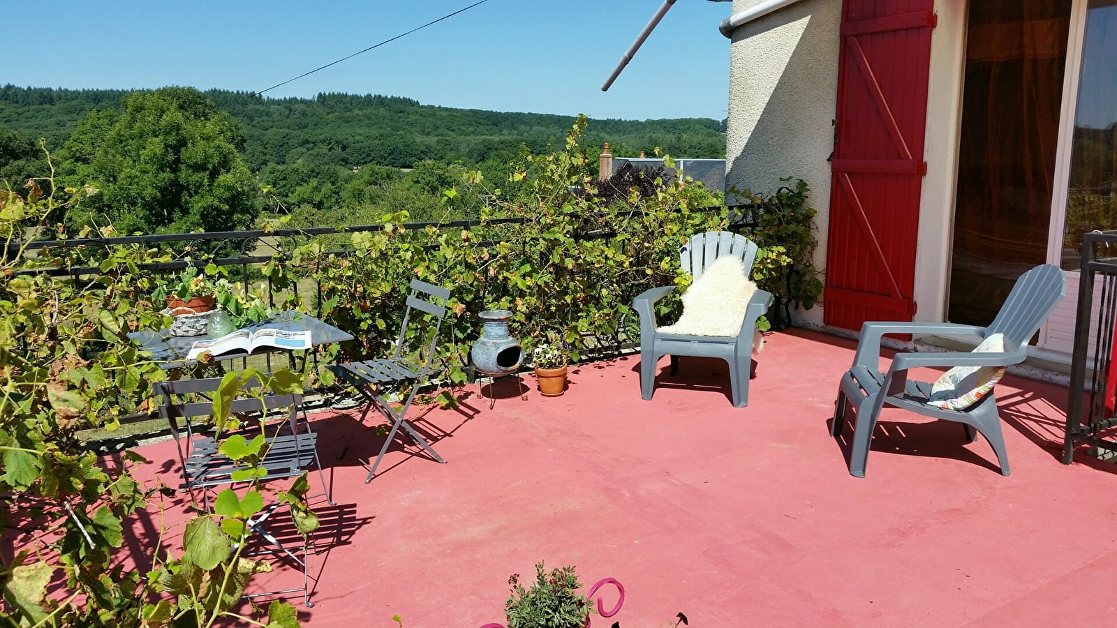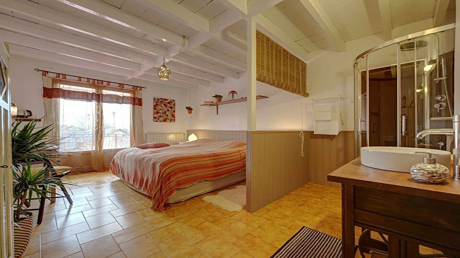 Nous vous offrons une chambre double spacieuse avec lavabo, douche, toilettes, des portes-fenêtres sur une terrasse ensoleillée, avec une belle vue. Un bel endroit pour le petit-déjeuner et pour se détendre. Des escaliers mènent à votre jardin privé.