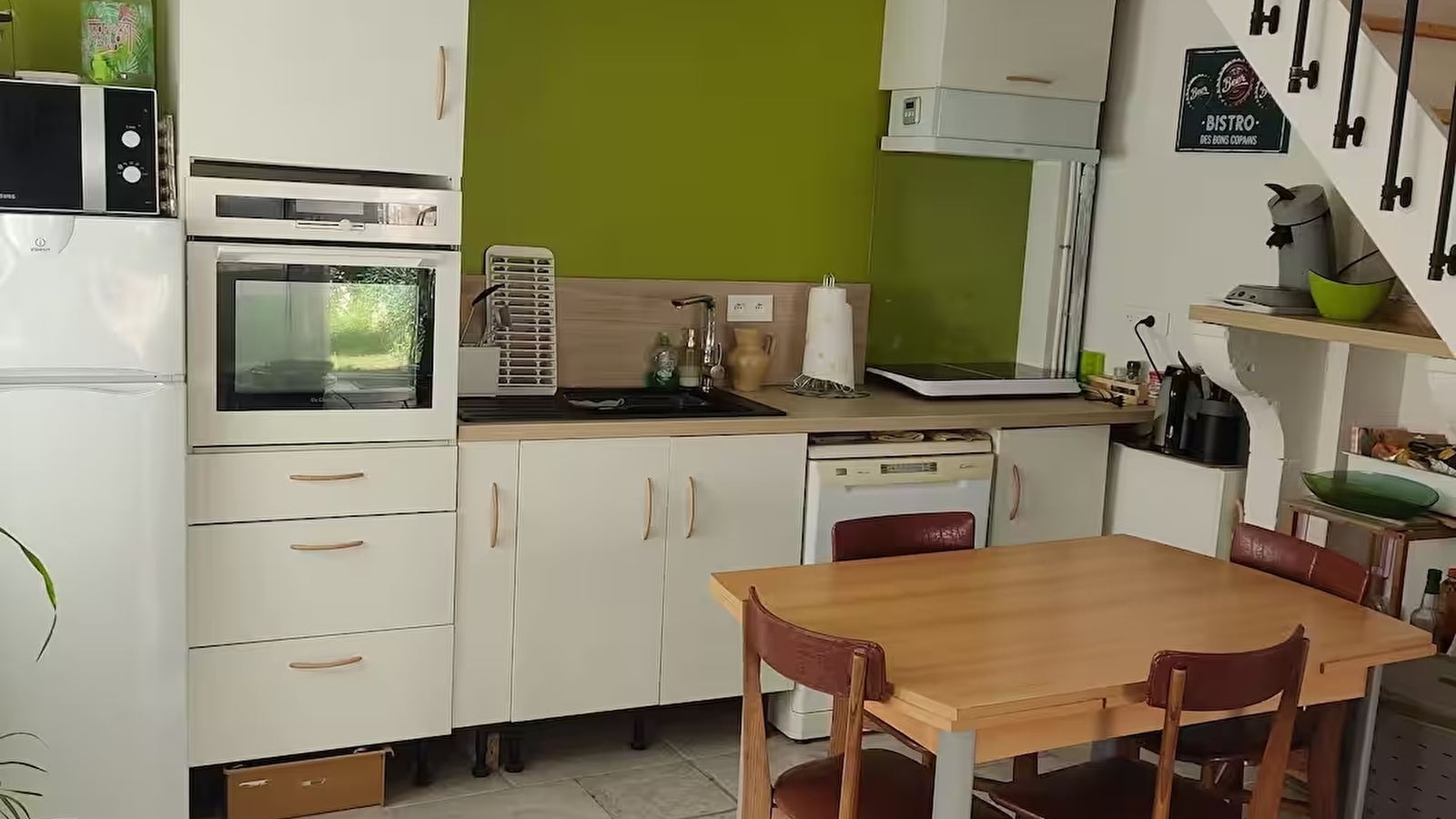 1 chambre avec 1 lit de 140 et 1 BZ, séjour ,salle à manger avec 1 clic clac, cuisine ouverte salle de bain, 2 wc, cour avec salon de jardin