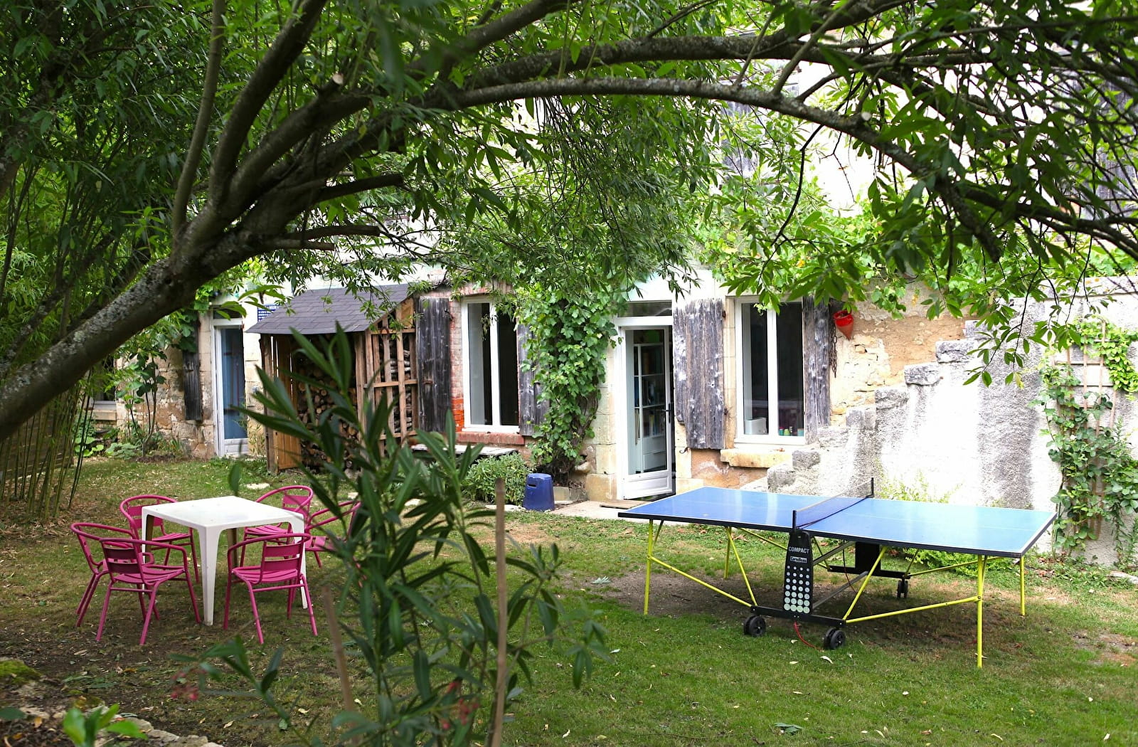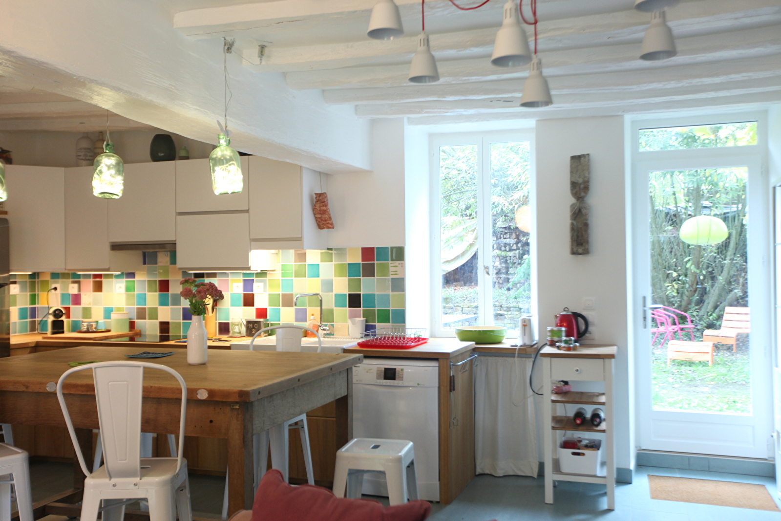 Hébergement avec une décoration cosy et joyeuse, un séjour-cuisine ouvert sur deux jardins de plain-pied, 2 chambres avec salle de bain.