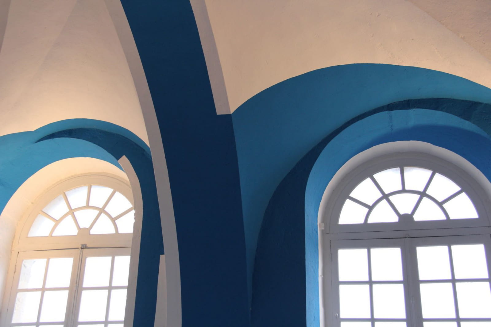 À l’initiative de la ville de Corbigny et en partenariat avec le Parc-Saint-Léger - Centre d'art contemporain de Pougues-les-Eaux qui n'existe plus aujourd'hui, le projet de Krijn de Koning réalisé spécifiquement pour l’Abbaye de Corbigny prend en compte les particularités de l'ancienne cuisine du monastère. Comme habituellement dans son travail, en France et à l’étranger, l’artiste repère les spécificités d’un espace et met en jeu des volumes qui en accentuent certains détails architecturaux. Une peinture murale réunit l’ensemble en épousant la forme d’une partie des voûtes, un peu comme une fleur qui se déploie sur les murs. L'œuvre intitulée : Omvang, Omgang, jeu de mots néerlandais difficilement traduisible, relie à la fois l’architecture et la déambulation du public, et dans sa version française devient « tour et détour ». Work for the Abbaye de Corbigny (blue) incite le visiteur à arpenter l’architecture en vivant une expérience inhabituelle qui l’engage à poser un autre regard sur le patrimoine.