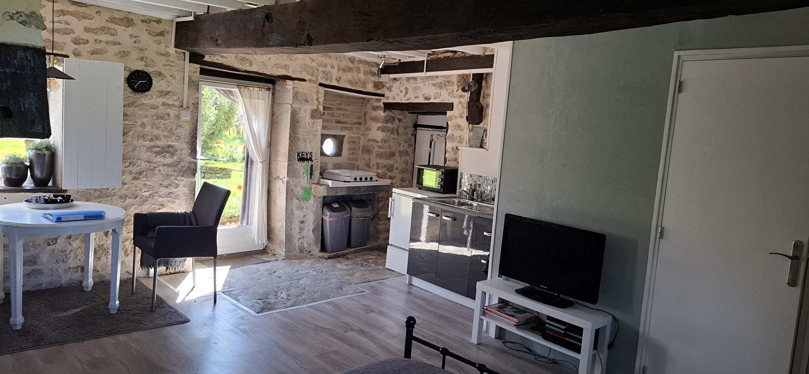 Le studio est adapté pour 2 personnes. Il y a une entrée privée. Le salon dispose d'un coin salon/repas, d'une télévision et d'un lit confortable 180x200. La kitchenette est entièrement équipée.