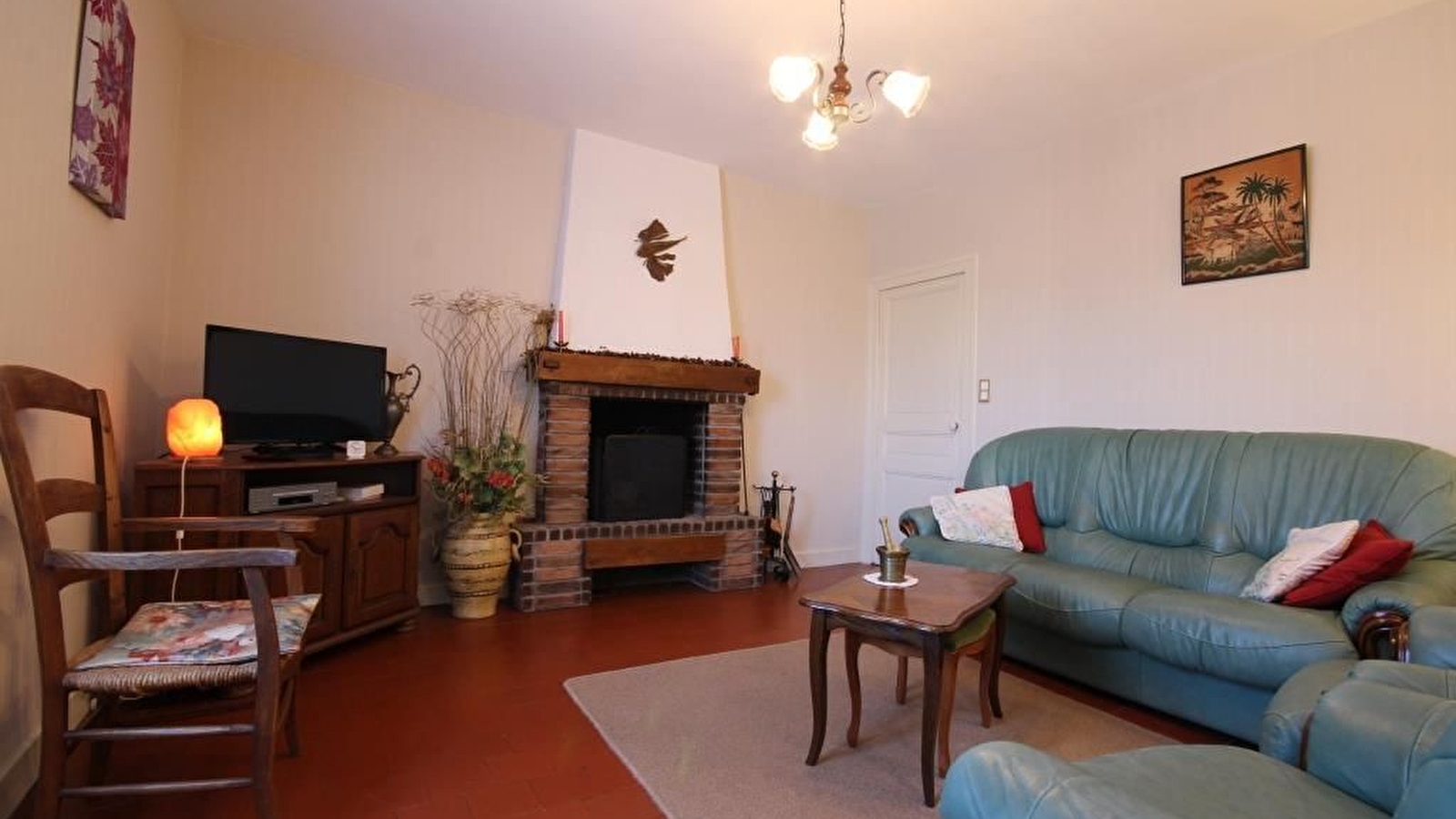 Maison individuelle située au bord de la D945 : cuisine, salle à manger, salon, buanderie avec lave-linge et sèche-linge, wc séparé, salle de bains (baignoire). Au 1er étage, 1 chambre avec 1 lit 120x190 et 1 canapé convertible pour 2 personnes, et 1 chambre avec 1 lit 140x190. Ping-pong, 2 VTT. Meubles de jardin, garage, cave. Grande cour close de 2500 m².