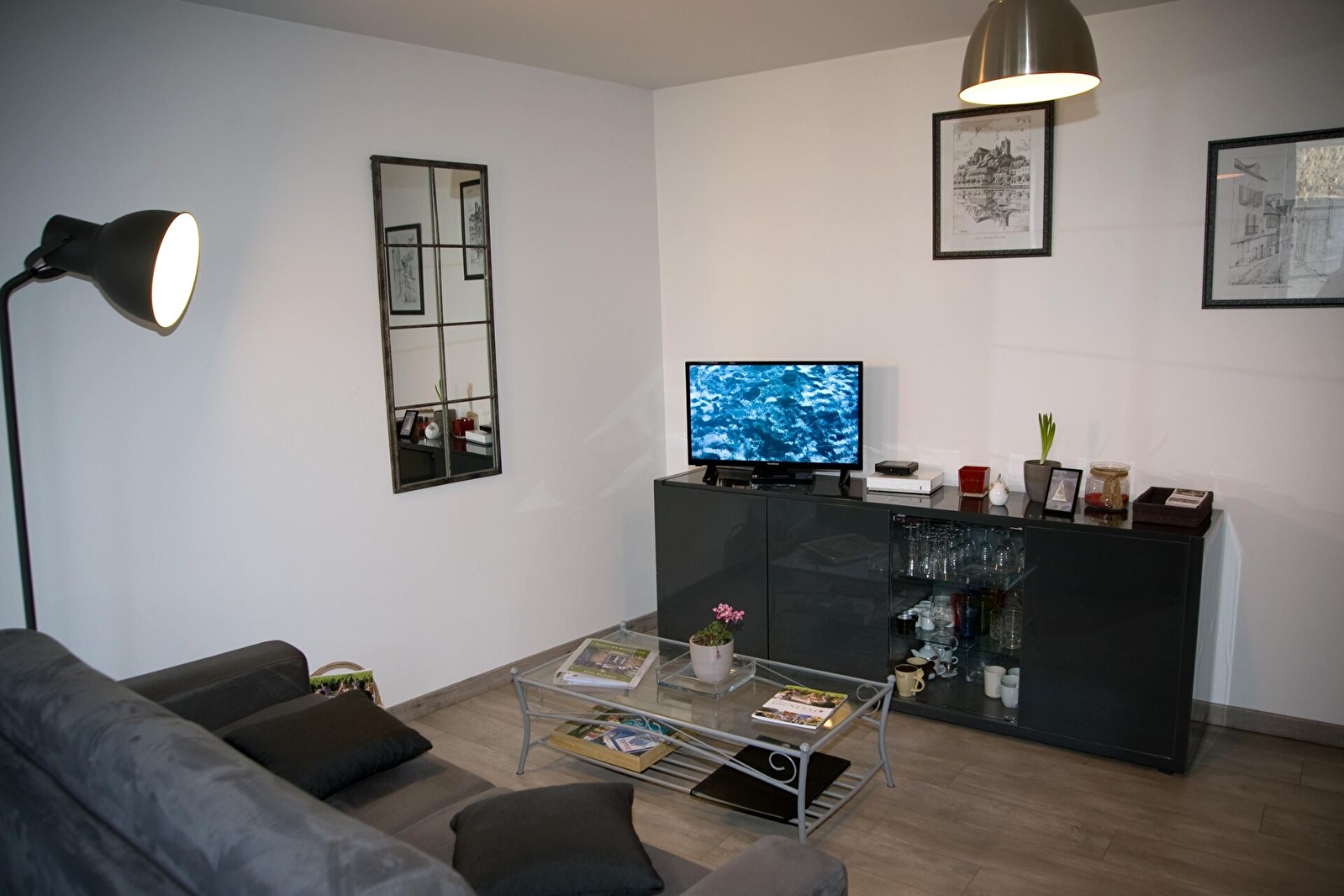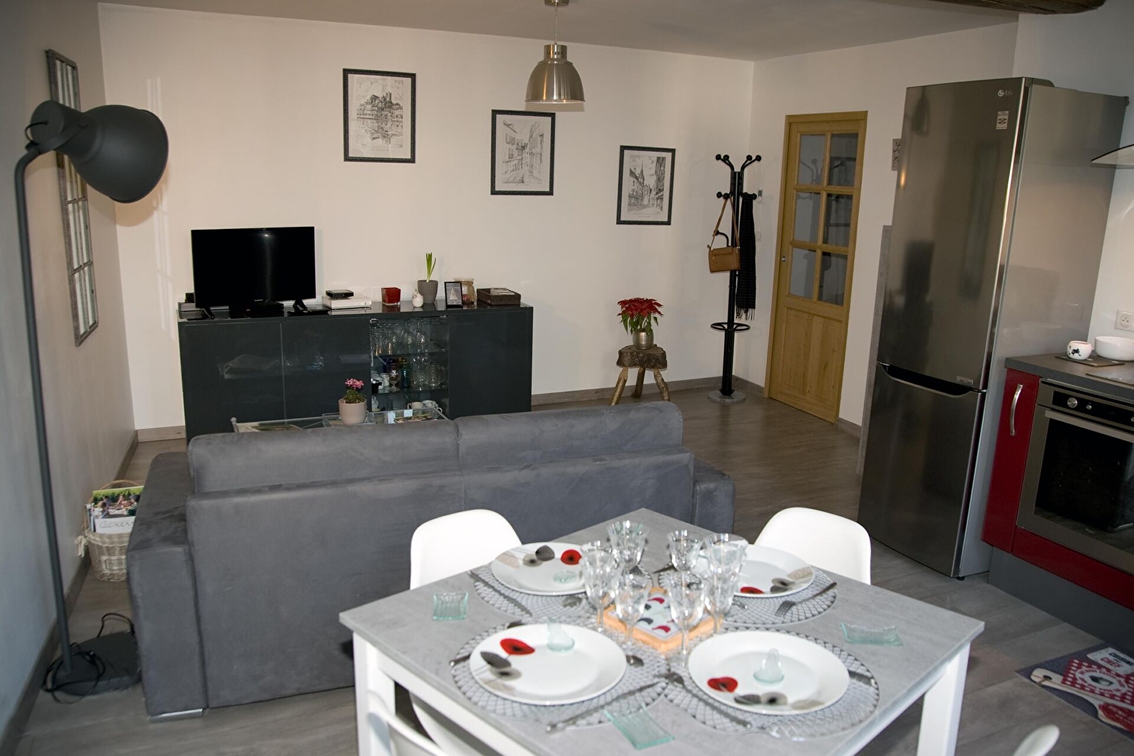 Notre meublé situé au 1er étage sans ascenseur, est composé d’une pièce de vie de 26 m2 avec cuisine intégrée entièrement équipée, d’un coin salon avec TV/ DVD et d’un convertible Rapido 140. Vous disposez d’une chambre spacieuse avec lit 160 desservant une salle d'eau avec douche à l'italienne. WC séparés et fermés situé dans le couloir.