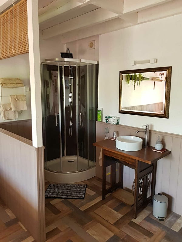 Votre sanitaire privé (douche, lavabo et wc) est à coté de la caravane.