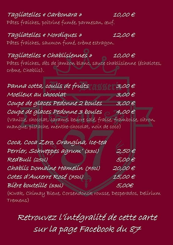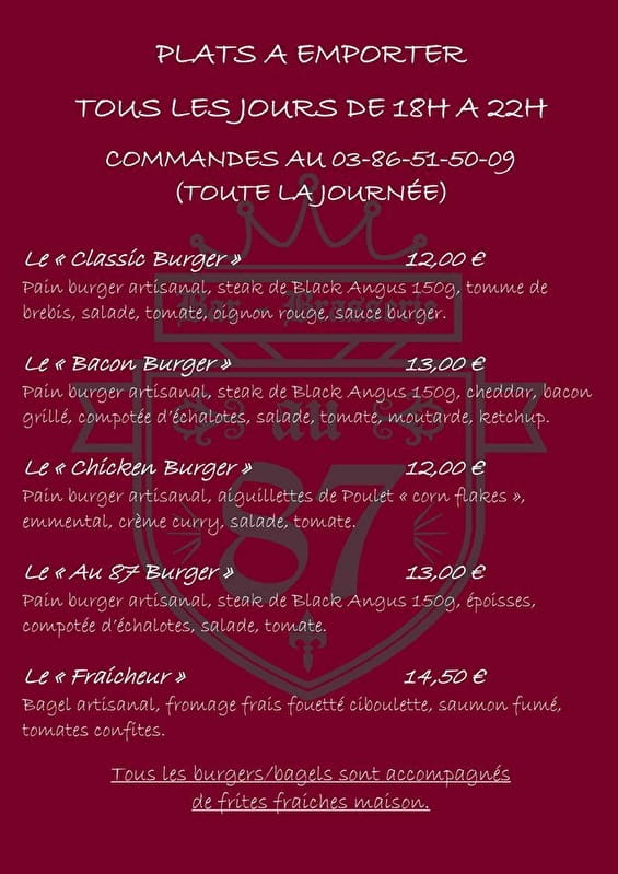 Dans une ambiance chaleureuse, le restaurant Au 87 vous propose une carte de tartes ou d'assiettes à base de produits frais et bio, et un plat du jour à base de thé avec les produits du marché.