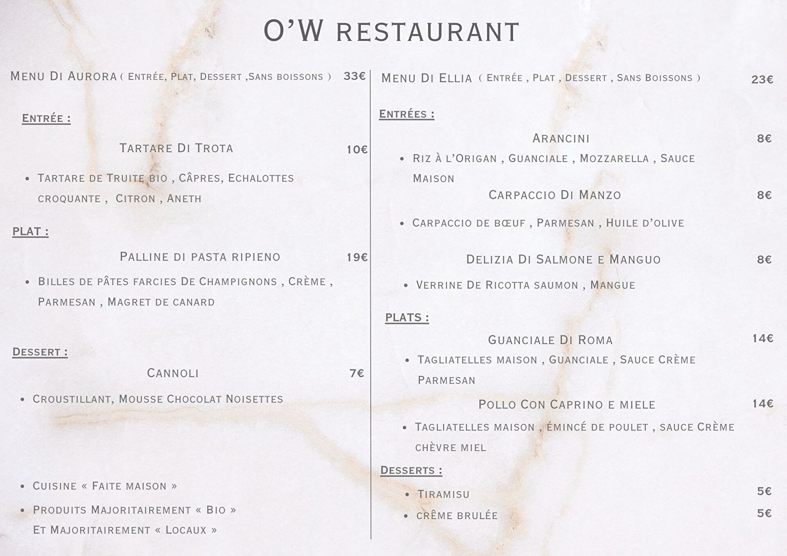 Tarifs :- Menu du jour : Compris entre 23€ et 33€ (menus sans boisson)