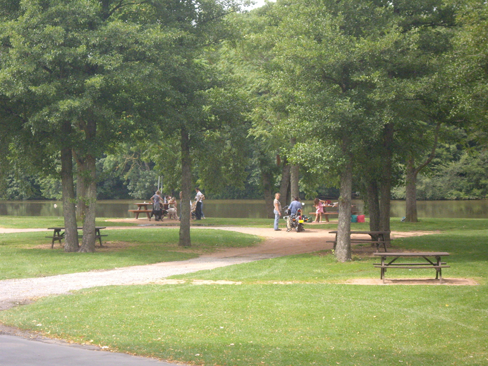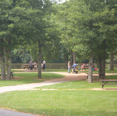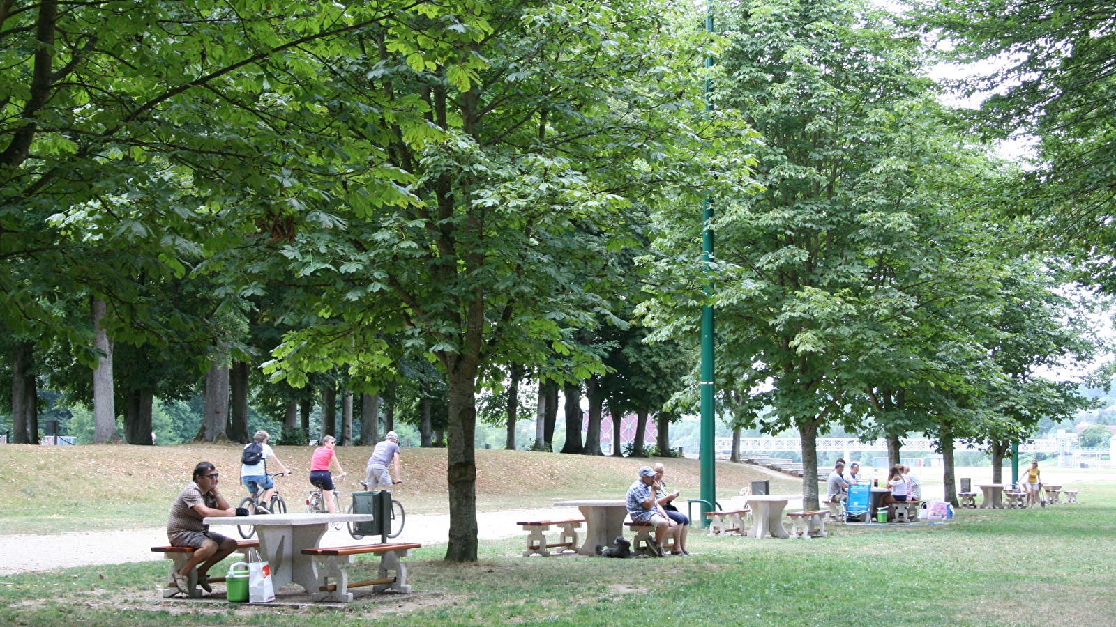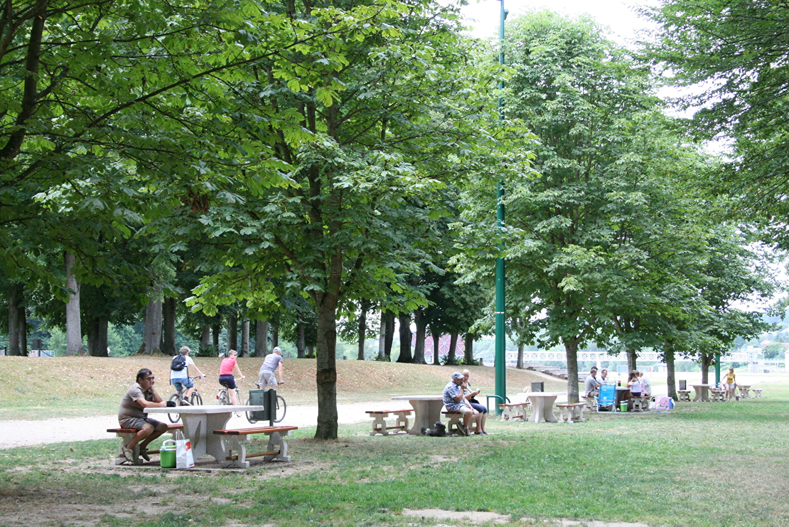 Plusieurs tables de pique-nique situées à proximité du Stade Nautique (base de loisirs) en zone piétonne, avec un très joli panorama sur la confluence des cours d'eau.