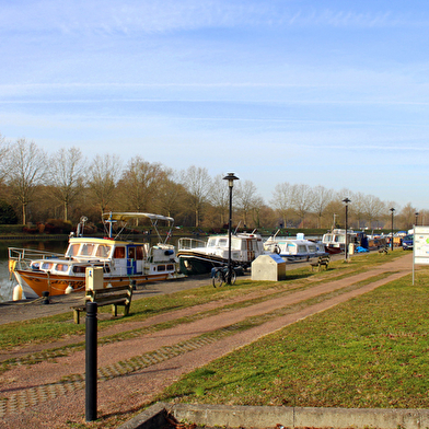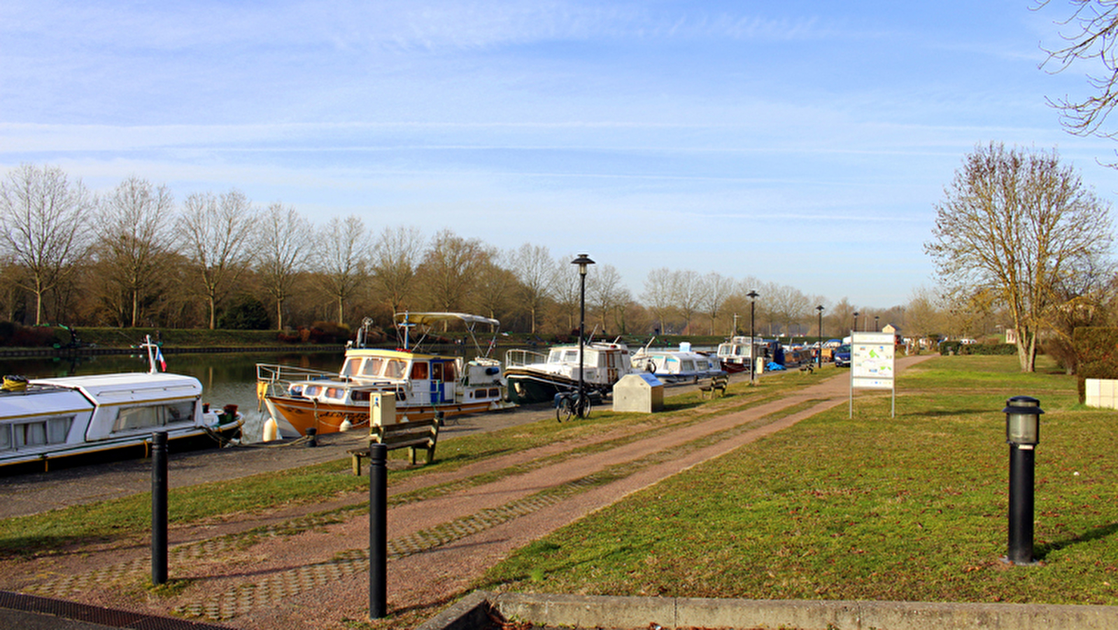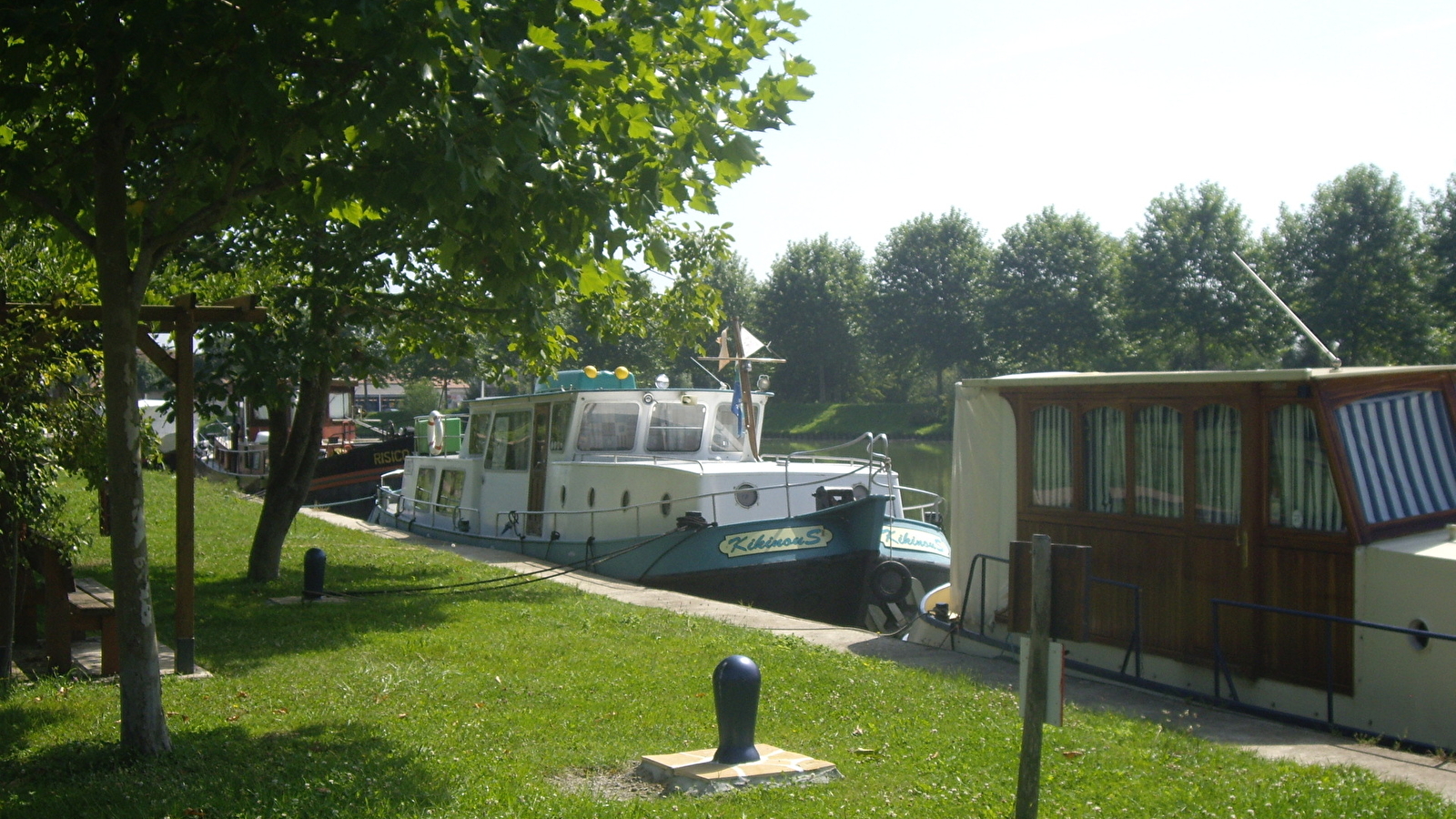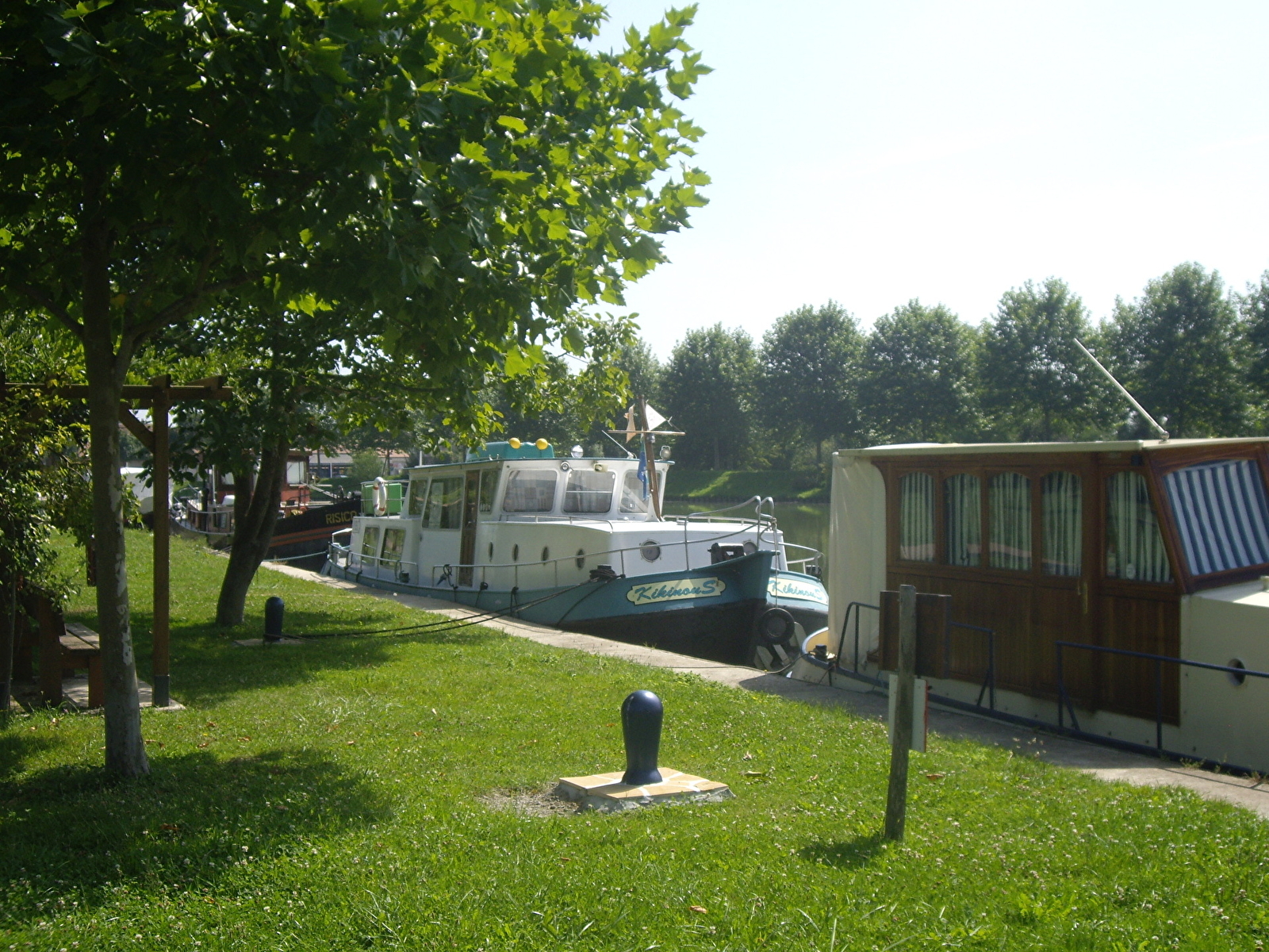 Aire de pique nique situées au calme au bord du canal du Nivernais avec de nombreux bateaux amarrés sur place.