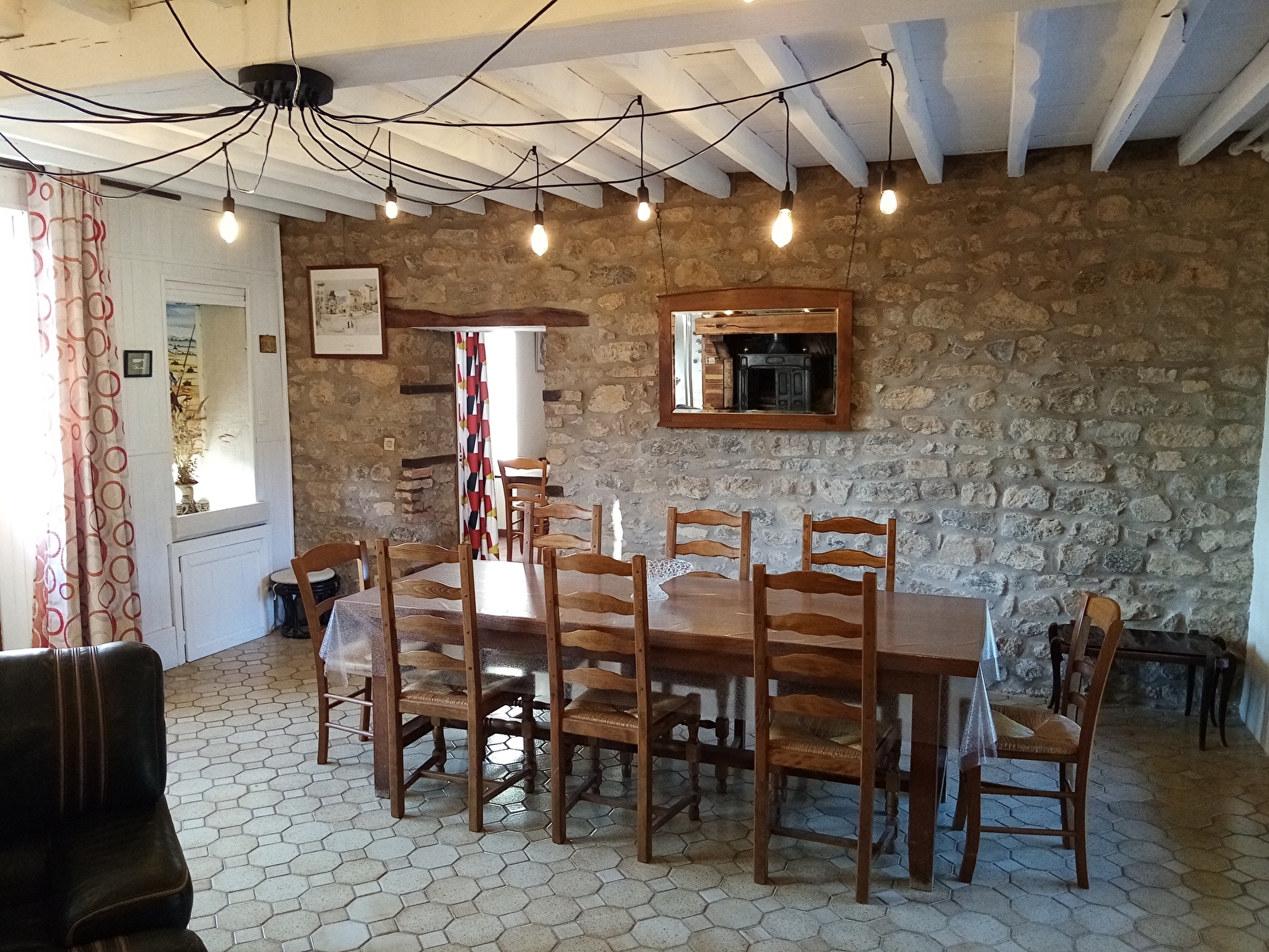 Salle à manger avec poêle a bois.