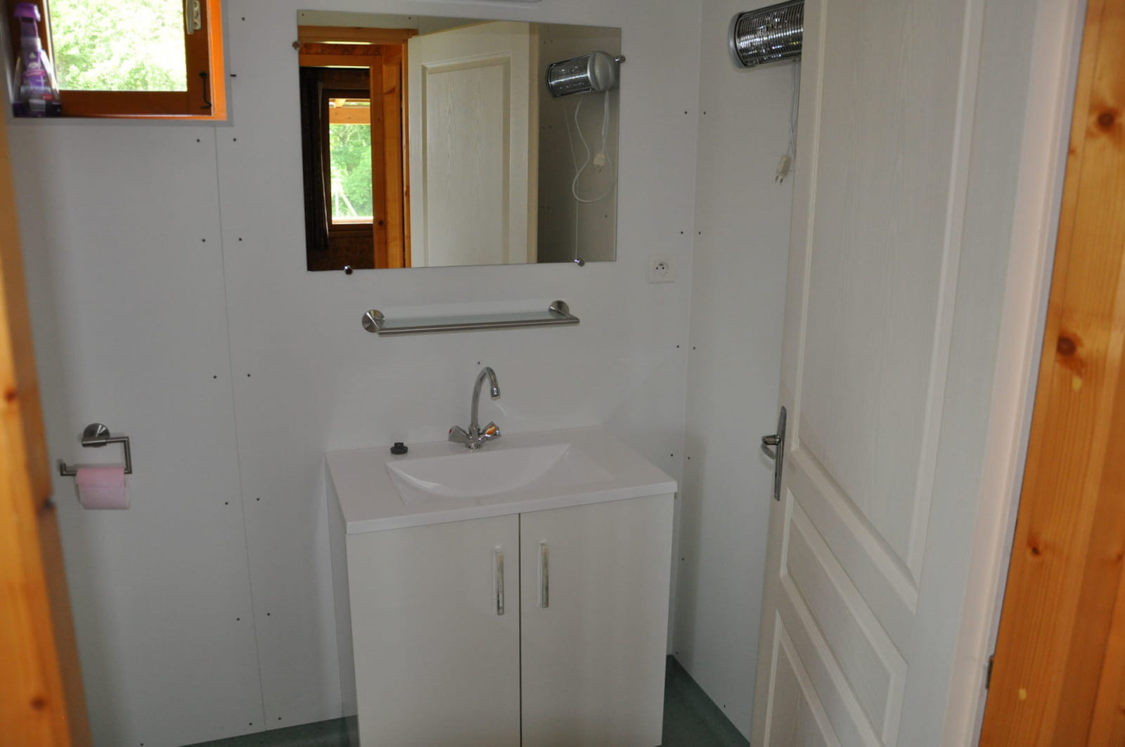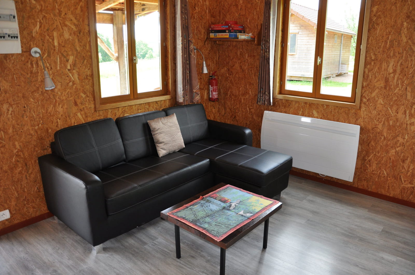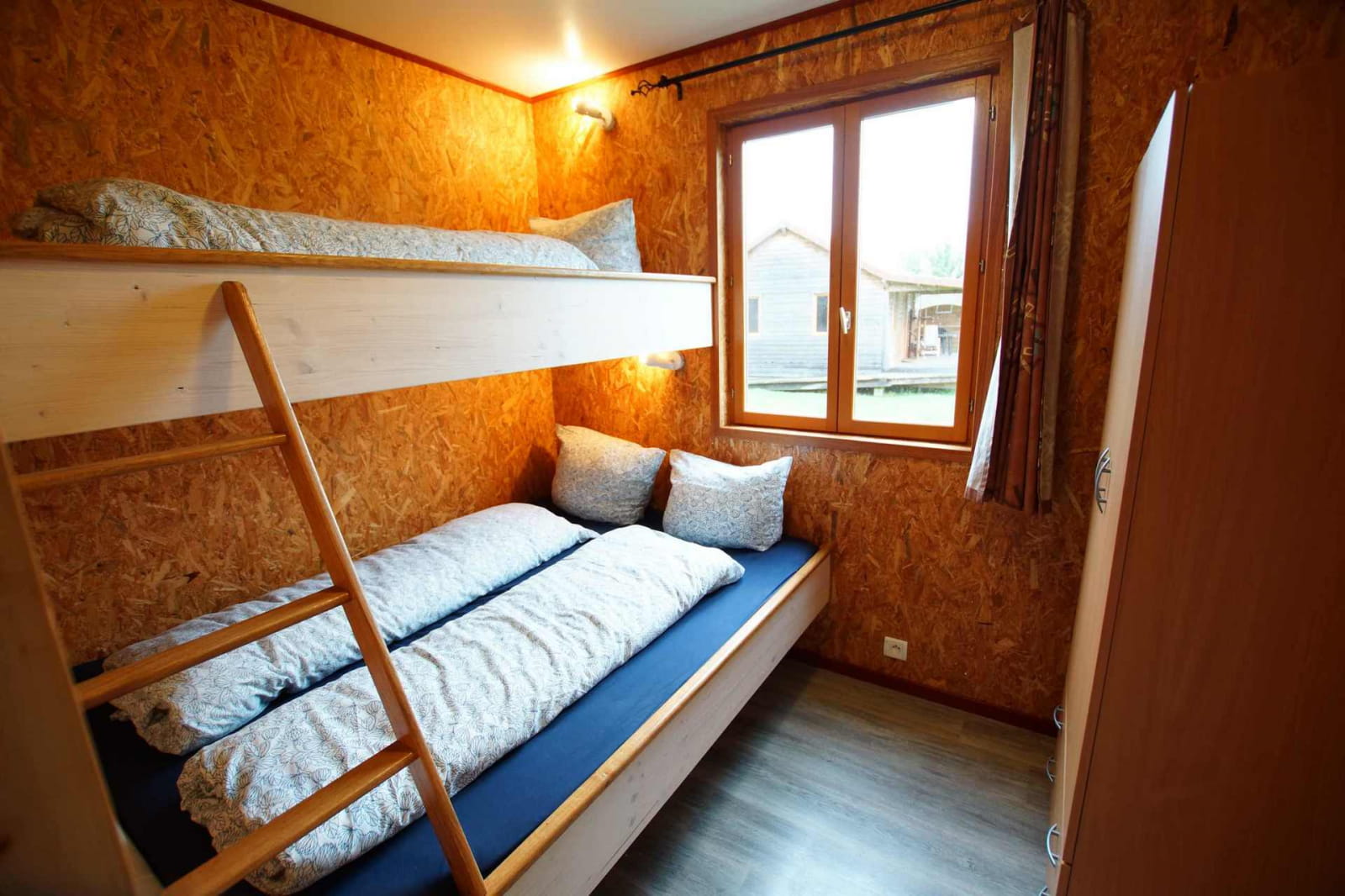 4 chalets (5 personnes) avec salon, cuisine aménagée( cafetière, micro-ondes, réfrigérateur, barbecue), salle d’eau, WC, 2 chambres (2 lits deux personnes + lit 1 personne) et terrasse. Les lits disposent de couettes. Un chalet est adapté pour personne à mobilité réduite. Restaurant sur place. Piscine dans le parc (6x12m) et trampoline pour les enfants. Possibilité de location de draps. Capacité 20 personnes.