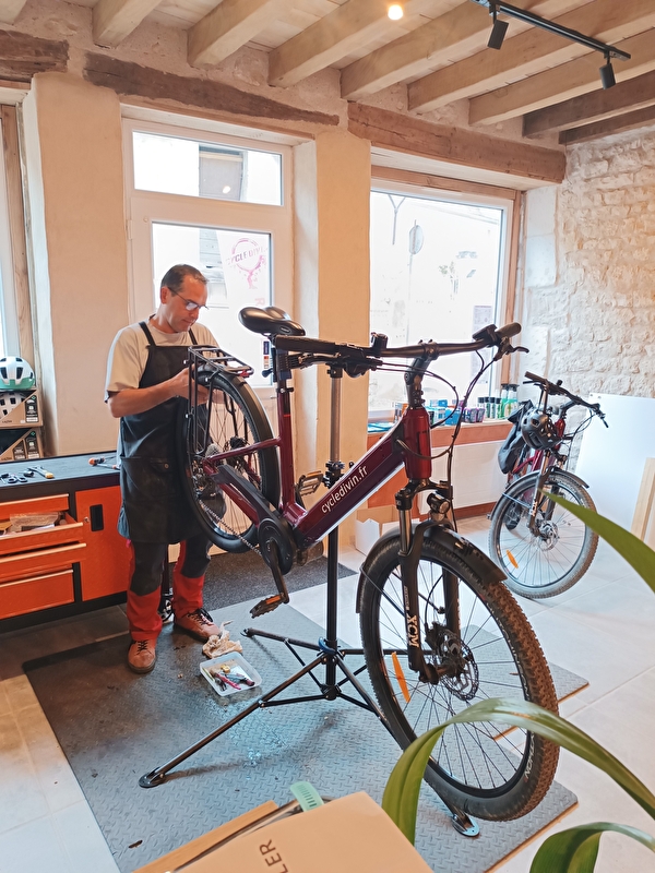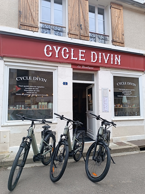 Atelier de réparation de vélos et boutique avec dégustation, vente de vins et de produits artisanaux, expositions.
