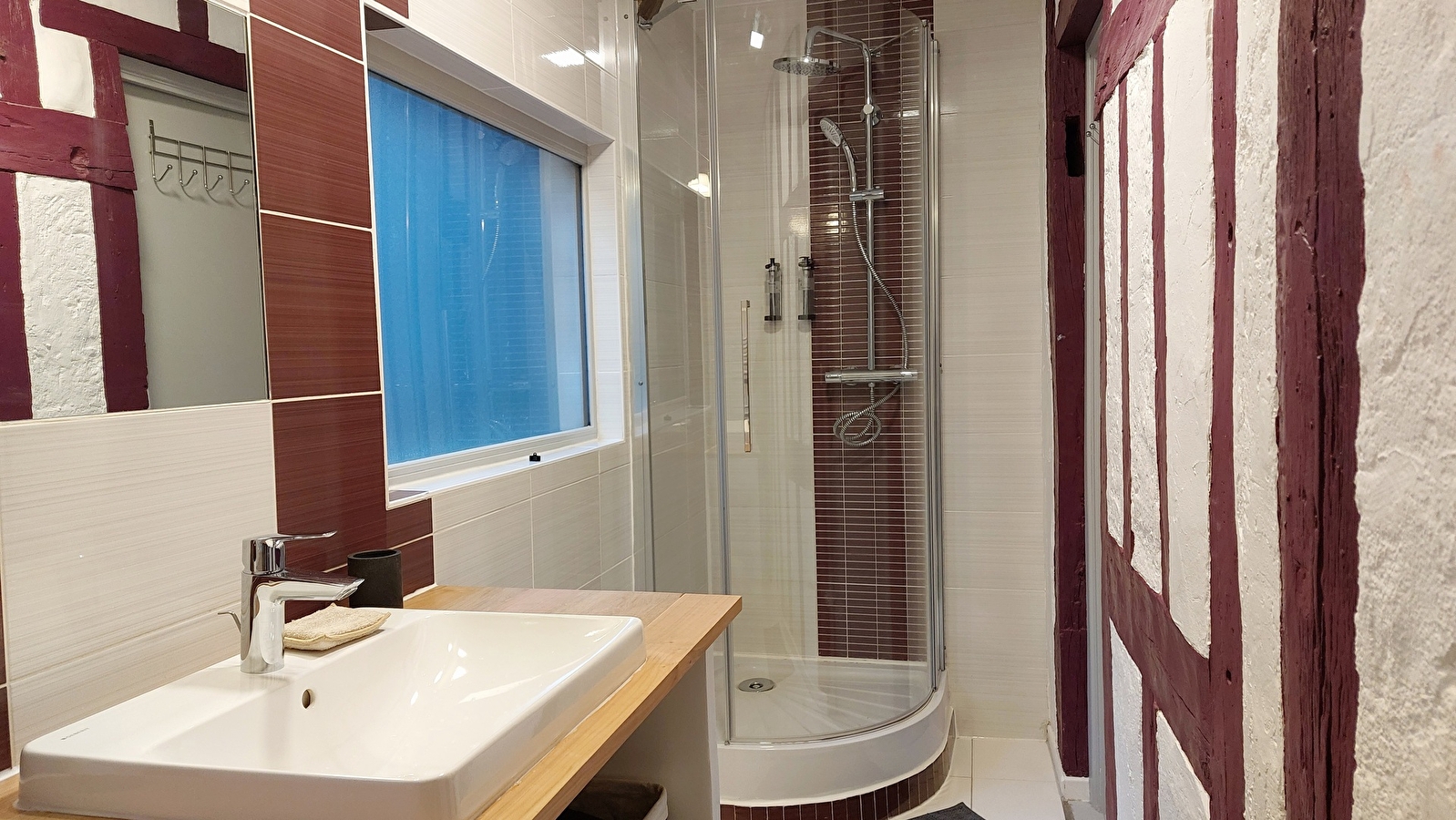 Elle donne sur la salle de bain avec douche et lave-linge (gel douche et sèche-cheveux à disposition).