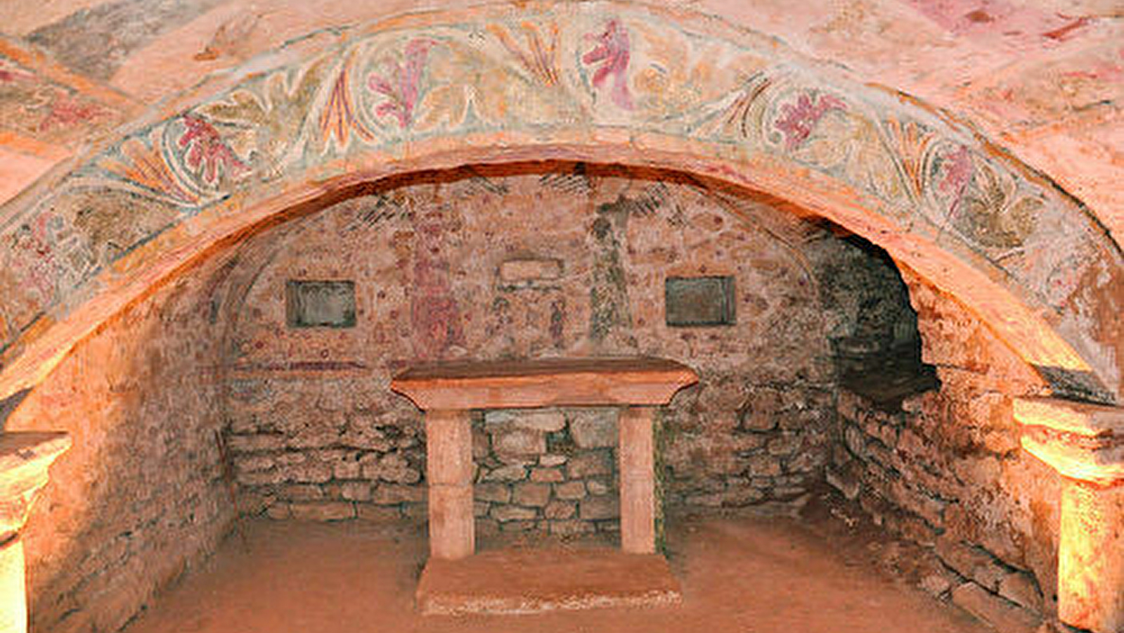 On y trouve donc trois niveaux de décoration de facture simple composant une procession. L’abondance des personnages portant des cierges rappelle que ce lieu sombre et souterrain est dédié à la lumière. Deux scènes sont consacrées à la crucifixion (mur Est) et au Christ triomphant, vainqueur de la mort.
