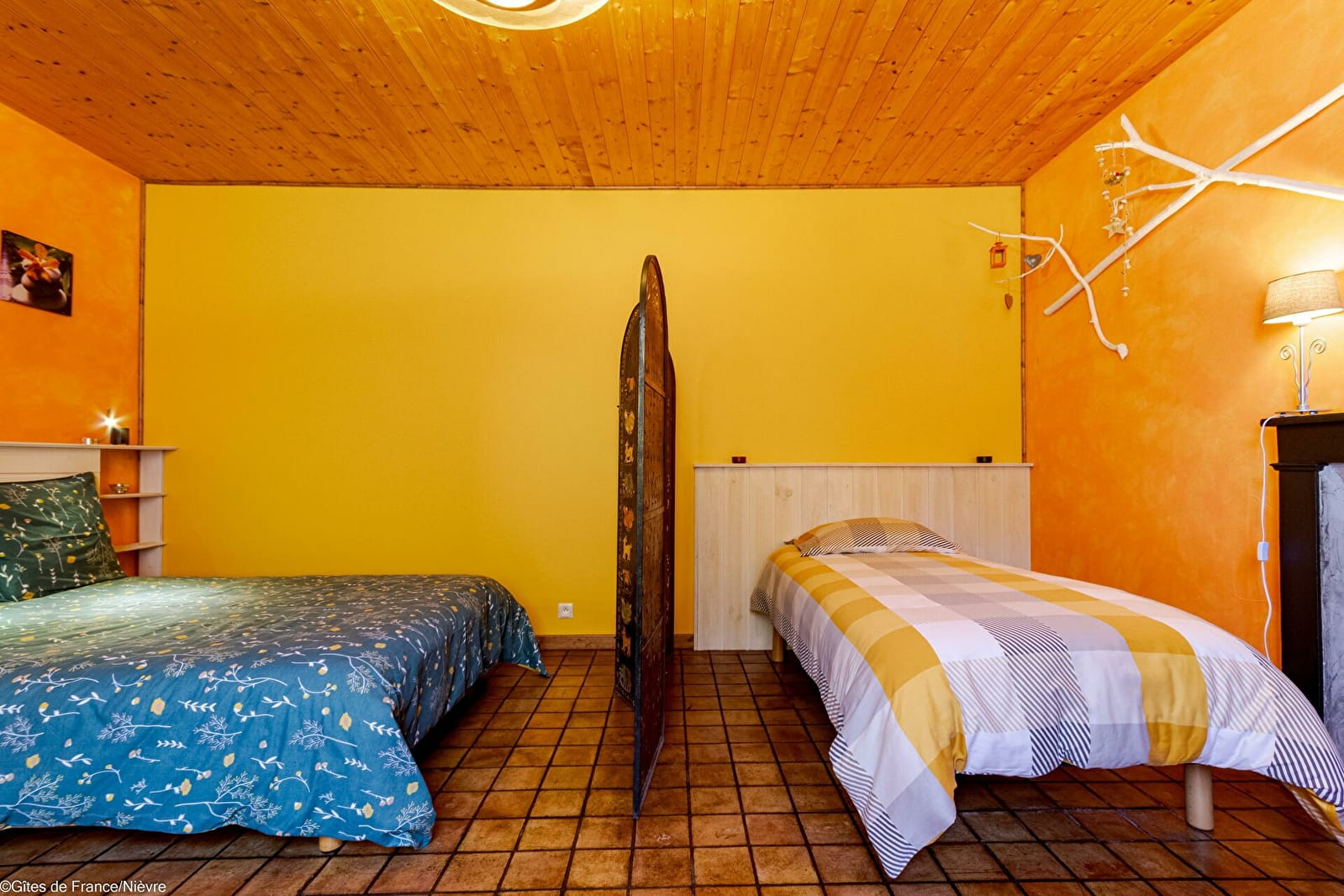 Au calme de la propriété du Moulin de Chevillon, à proximité des propriétaires, gîte tout confort avec une cuisine ouverte sur le salon, 1 chambre avec 1 lit 140x190 et 1 lit 90x190, 1 chambre avec 1 lit 140x190, une salle d'eau avec douche et wc indépendant.