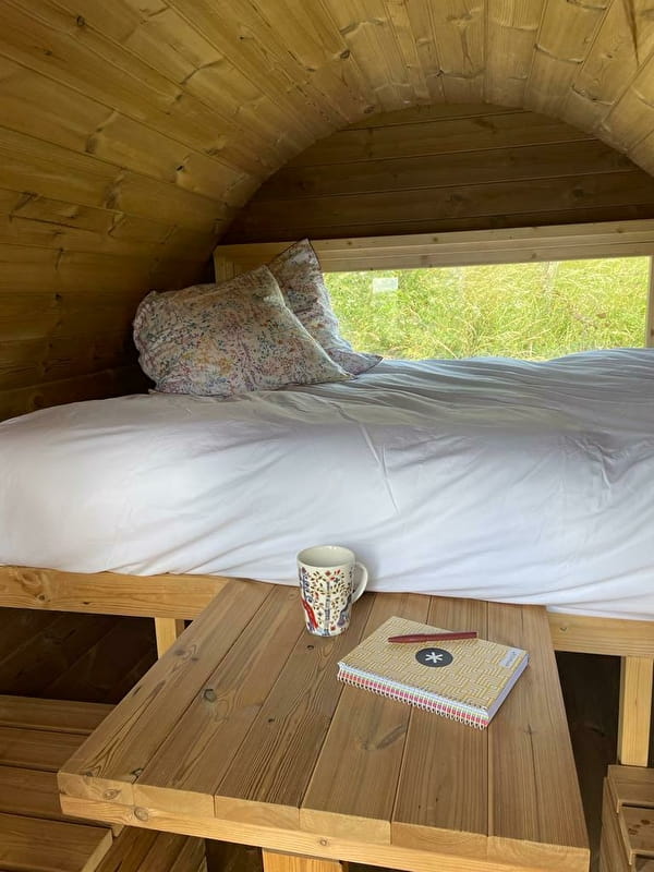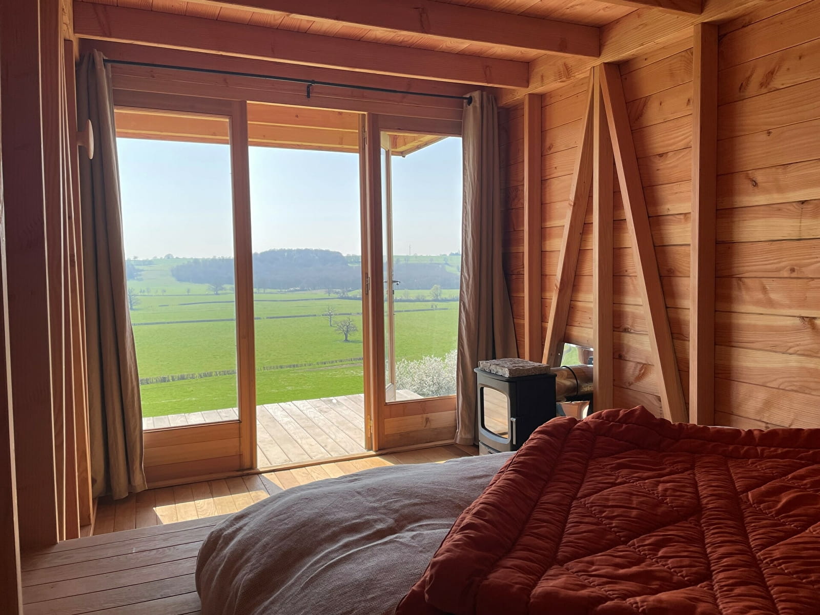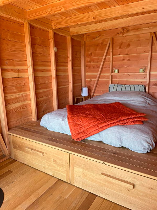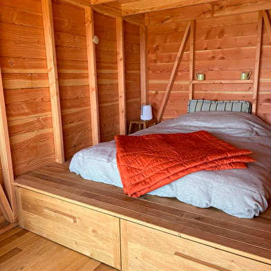 Les cabanes sont équipées d'un lit de 140 ou 2 lits de 90, un poêle à bois ultra performant, une hotte pour le bois, tiroirs de rangement et porte-manteaux, bouilloire et tasses, grande baie vitrée et terrasse.