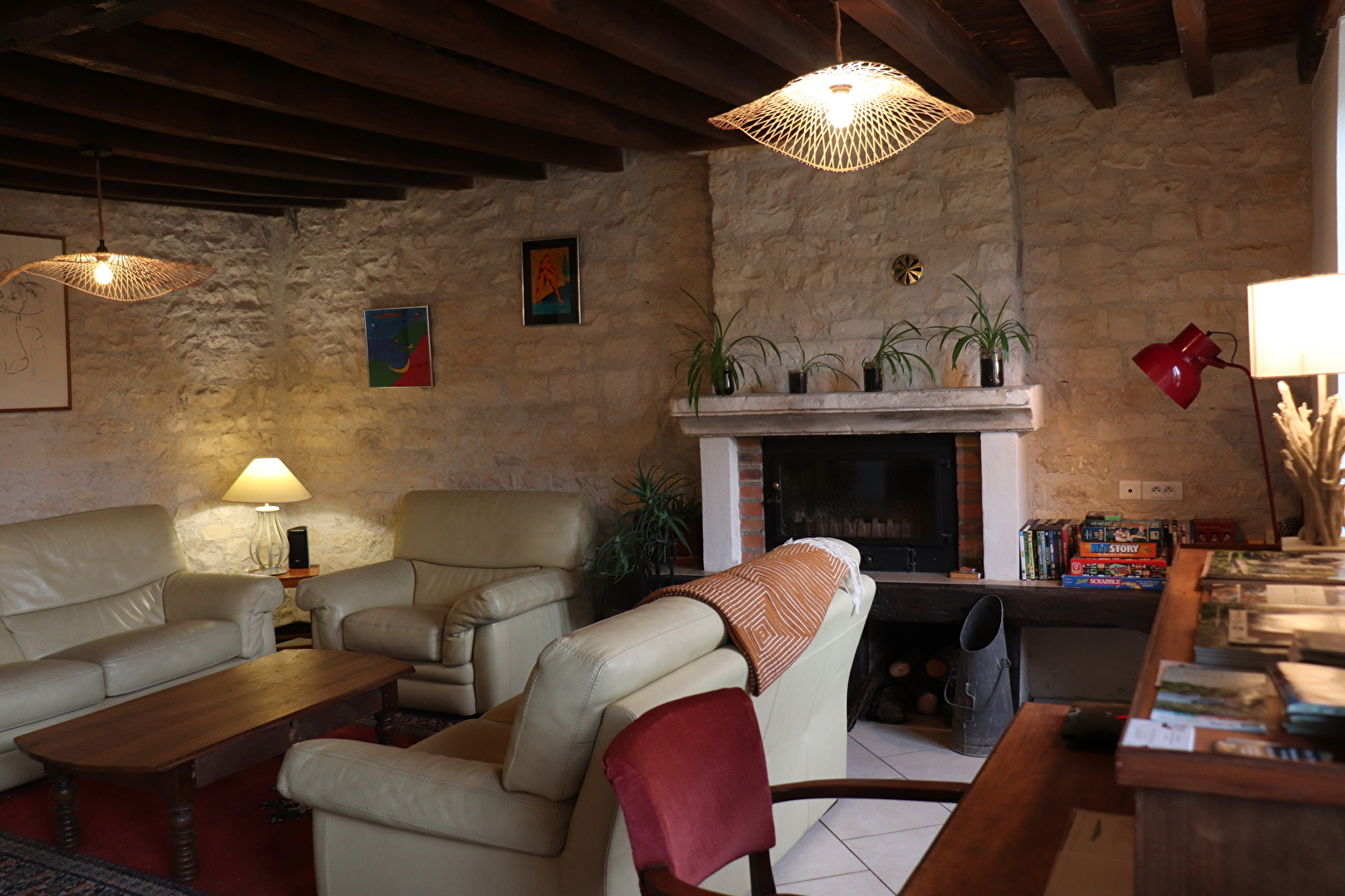En automne et en hiver, le gîte se prête particulièrement aux séjours hors saison. La présence d’une cheminée crée une atmosphère chaleureuse, idéale après une journée de visites ou de balades, pour profiter d’un séjour reposant.