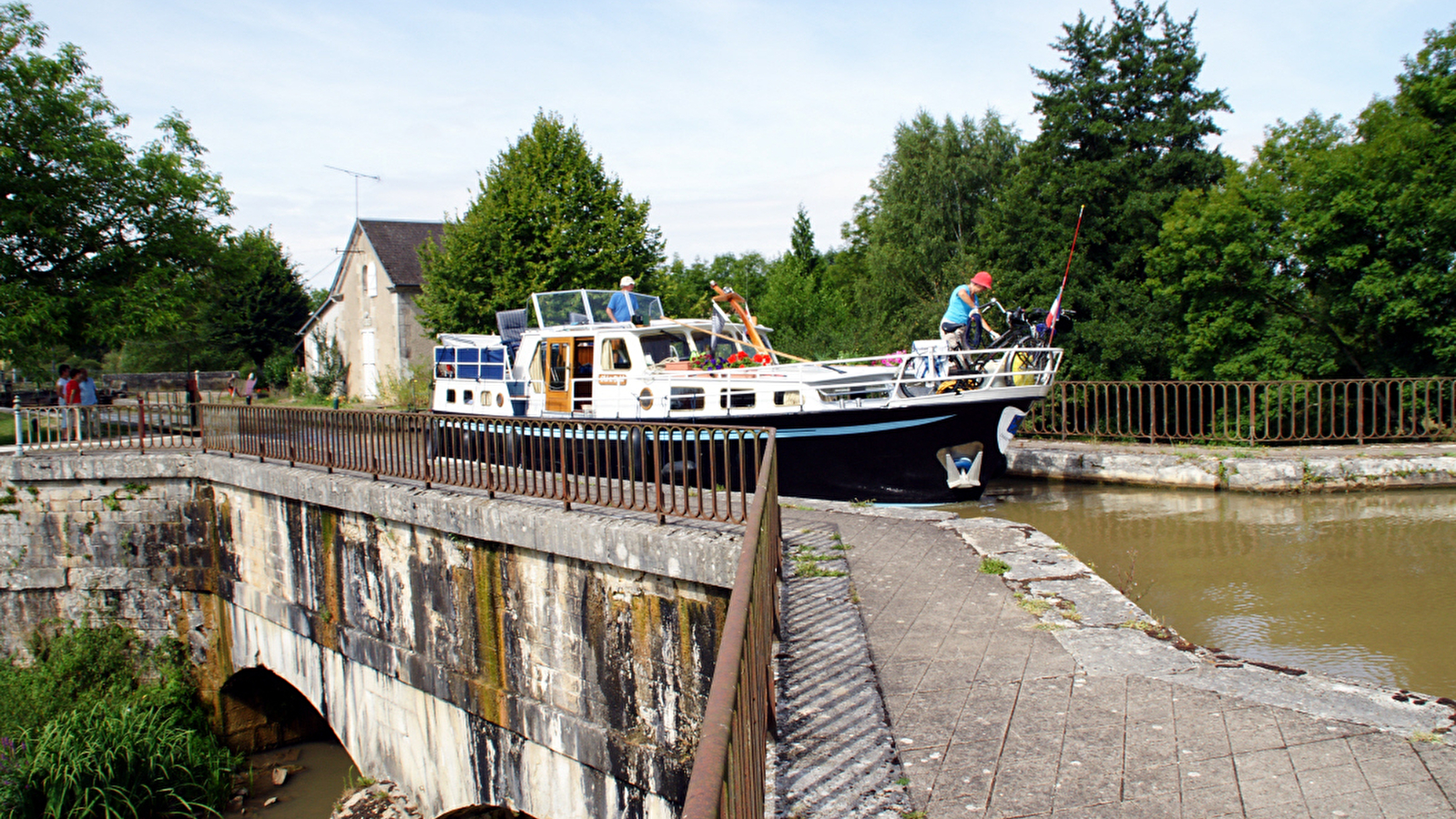 A cet endroit, le Canal du Nivernais emprunte un pont-canal enjambant le cours d'eau Aron. Ce magnifique ouvrage d'art, récemment restauré, se laisse admirer sans modération : les bateaux montant ou descendant l'écluse, dans ce cadre apaisé et bucolique, sous les regards curieux des cyclistes et à l'ombre de la tranquillité des pêcheurs...